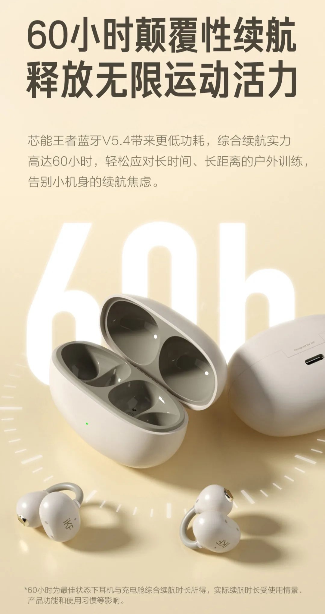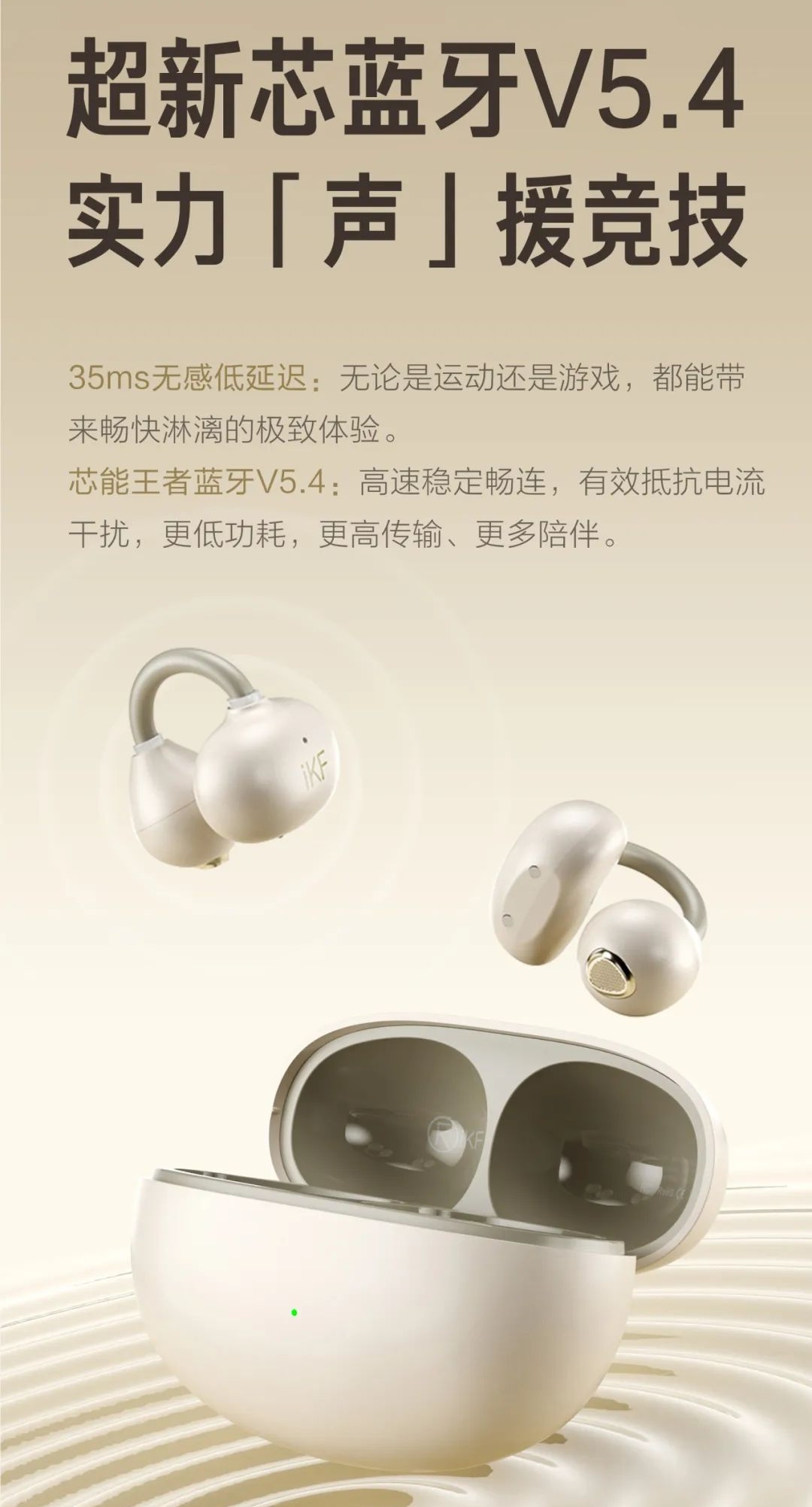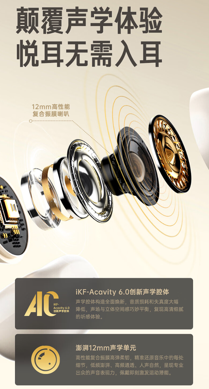iKF Air Clip 开放式耳机支持“DT6.0 脉冲定向传音技术”,官方称可降低 96% 漏音情况;该耳机支持蓝牙 5.4 协议,搭配耳机仓使用,综合续航约 60 小时,同时内置空间音效算法。