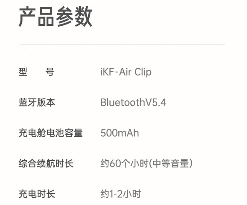 IT之家附 iKF Air Clip 开放式耳机亮点信息及产品参数如下:
