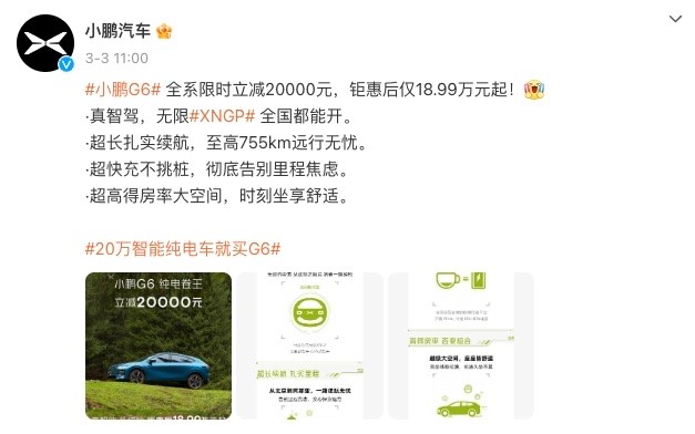 3日,小鹏汽车宣布,2024年3月31日前小鹏G6全系车型限时立减20000元,优惠后售价为18.99万元起。