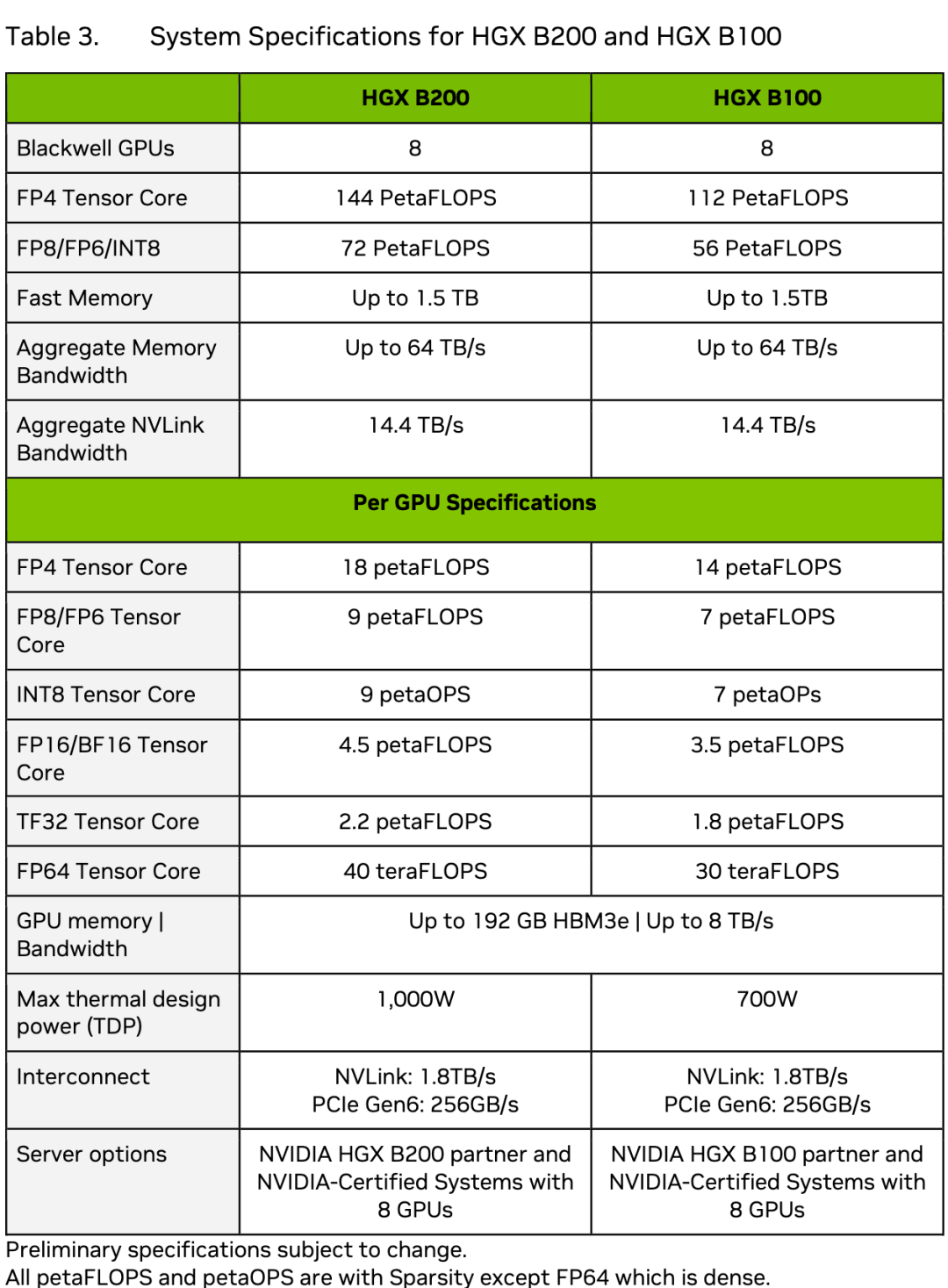 技术简报披露了 Blackwell x86 平台 HGX B100、HGX B200 的系统配置。HGX B200 搭载 8 个 B200,每个 GPU 的 TDP 为 1000W;HGX B100 搭载 8 个 B100,每个 GPU 的 TDP 为 700W。
