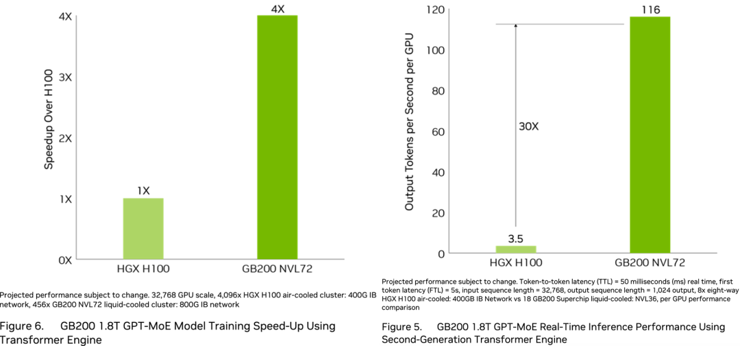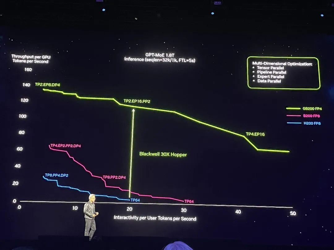 但如果从系统性能来看,相比上一代 Hopper 集群,Blackwell 可将 1.8 万亿参数的 GPT-MoE 推理性能提高到 30 倍。