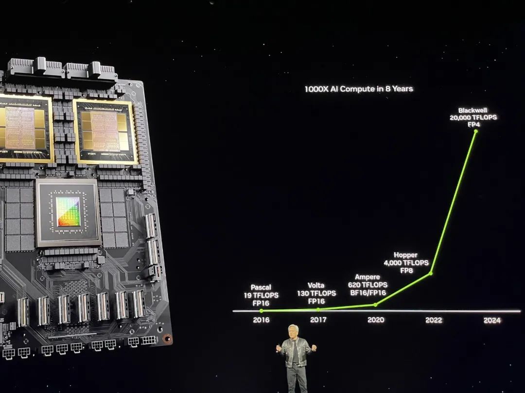 从 2016 年 Pascal GPU 的 19TFLOPS,到今年 Blackwell GPU 的 20PFLOPS,黄仁勋宣布英伟达用 8 年将单卡 AI 训练性能提升了 1000 倍。