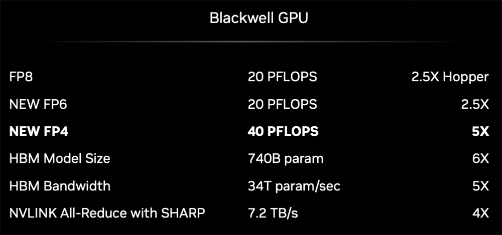从单卡来看,相比 H100,Blackwell GPU 的训练性能仅提高到 2.5 倍,即便按新添的 FP4 精度算,推理性能也只提高到 5 倍。