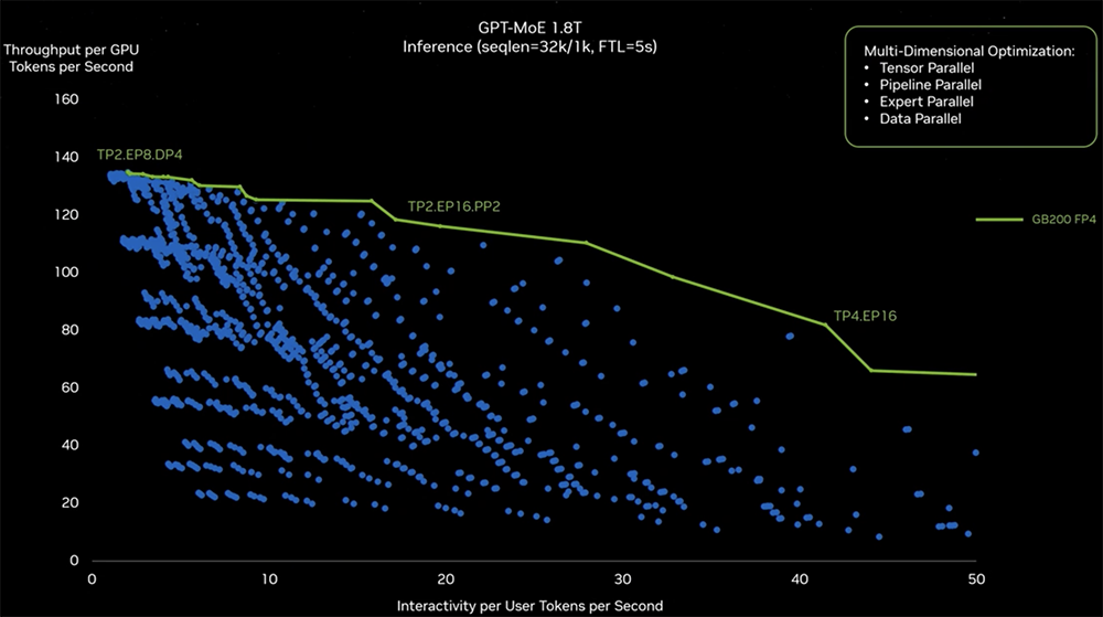 为了找出 GPT-MoE 训练的正确并行配置,英伟达做了大量实验(得到图中的蓝点),以探索创建硬件和切割模型的正确方法,使其尽可能实现高效运行。其探索包括一些软件重分块、优化策略判断,并将大模型分布在不同的 GPU 中来满足性能需求。