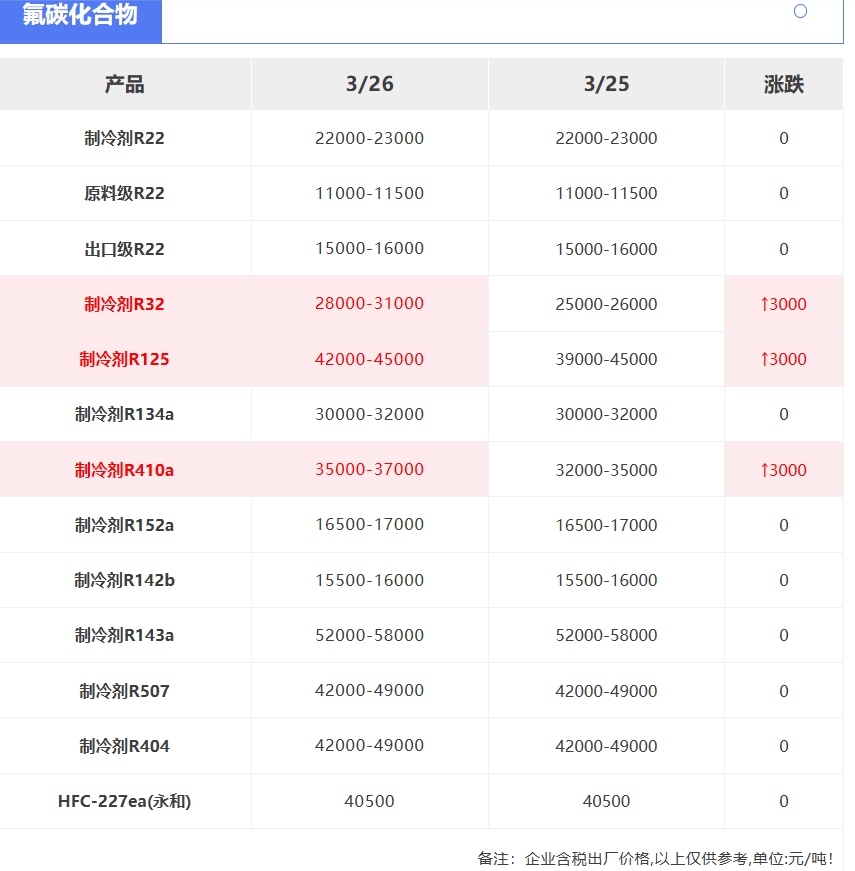 进入3月,国内主流制冷剂价格上行趋势不改。3月18日至3月22日,制冷剂R22报价2.2万元/吨,较上周(即3月11日至3月15日,以下同)上行500元/吨;制冷剂R32均价2.55万元/吨,较上周上涨1000元/吨;制冷剂R125均价报4.45万元/吨,较上周上涨500元/吨;制冷剂R134a均价3.4万元/吨,较上周上涨1500元/吨。3月26日晚间,氟务在线、卓创资讯(301299)均发布数据称,上述主流制冷剂价格较前一日出现跳涨。