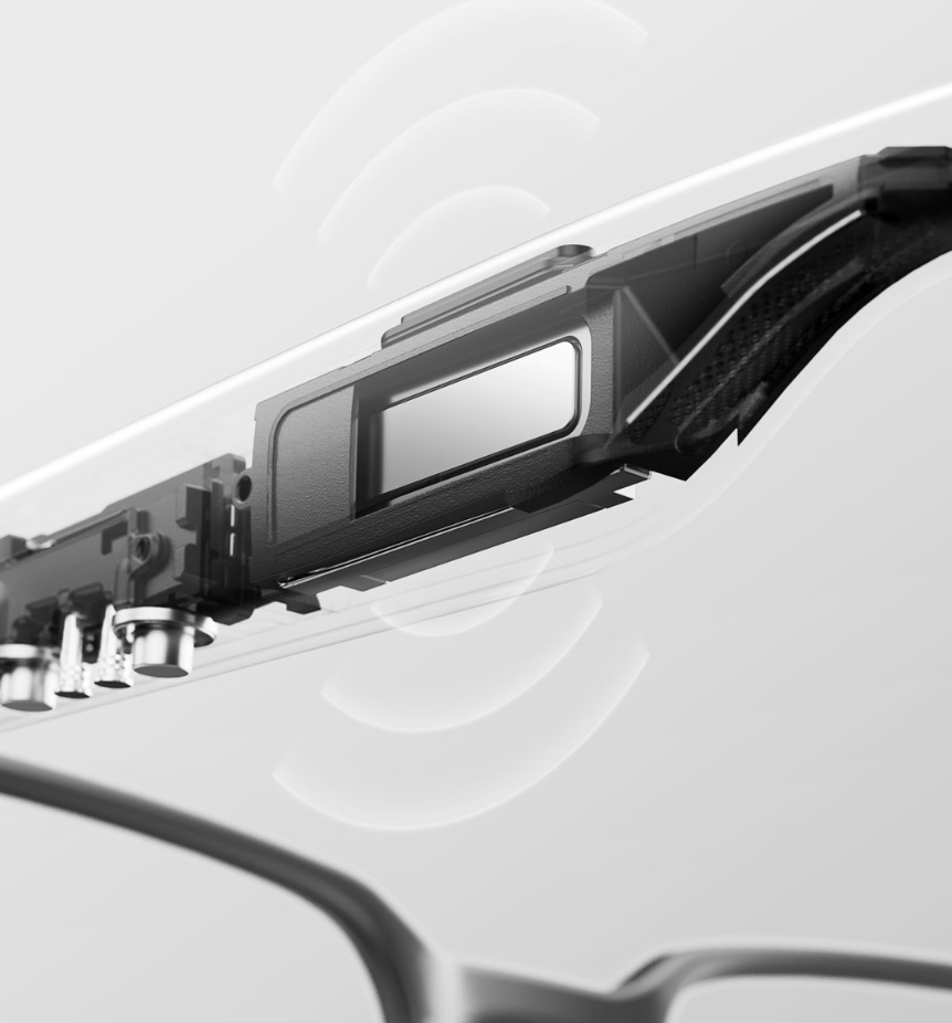 该眼镜的音频部分采用气传导的开放声场技术,搭载 SLS0820?超声线扬声器融合音腔结构算法,还配有双重防漏音技术,支持通话降噪。