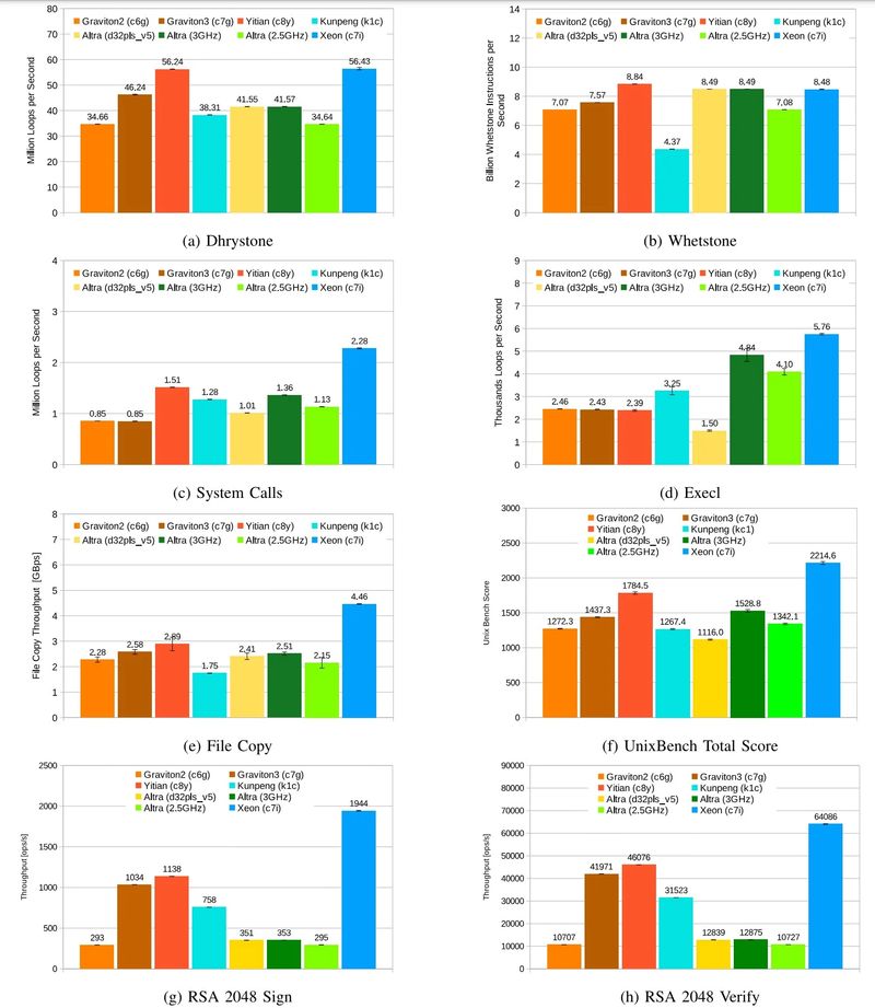 该项目由新加坡国立大学计算学院研究助理教授 Dumitrel Loghin 带领,在 8 个云服务器上测试了 5 款 Arm 服务器处理器、以及英特尔至强 Platinum 8488C(2023 年第 1 季度发布的 Sapphire Rapids)。