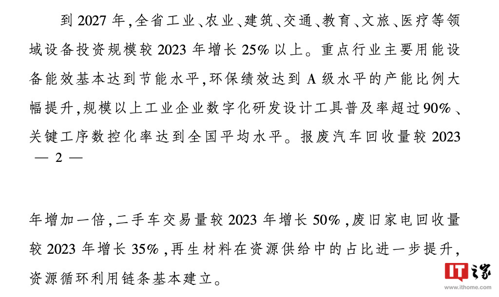 IT之家 5 月 13 日消息,四川省人民政府近日印发《四川省推动大规模设备更新和消费品以旧换新实施方案》,其中提出到?2027?年四川省报废汽车回收量将较 2023 年增加一倍,二手车交易量较 2023 年增长 50%,废旧家电回收量较 2023 年增长 35%。