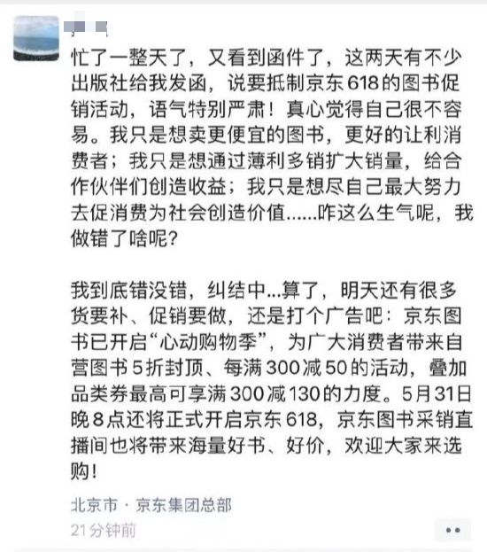 今日上午,京东图书采销员工公开回应这一抵制事件。该工作人员称,他们只是想卖更便宜的图书,更好地让利消费者;想通过薄利多销扩大销量,给合作伙伴们创造收益;只是想尽自己最大努力去促消费为社会创造价值。该员工还表示:“咋这么生气呢,我做错了啥呢?”