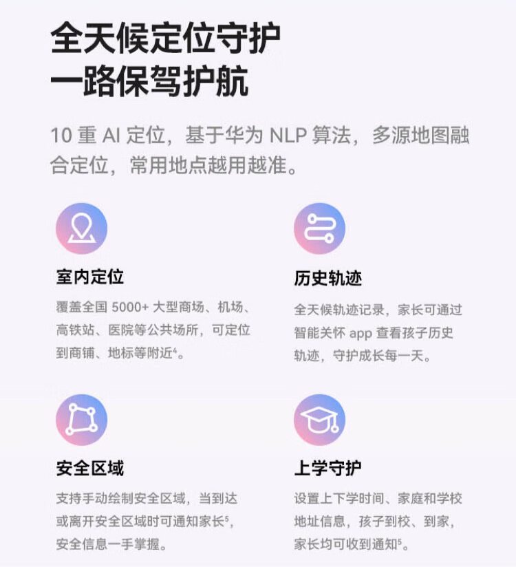 华为儿童手表 5 新耀版采用 10 重 AI 定位,基于华为 NLP 算法,可实现多源地图融合: