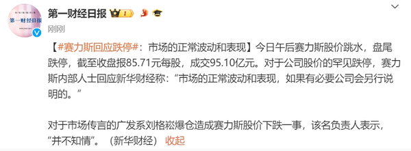 赛力斯内部人士回应股价跌停:市场的正常波动和表现