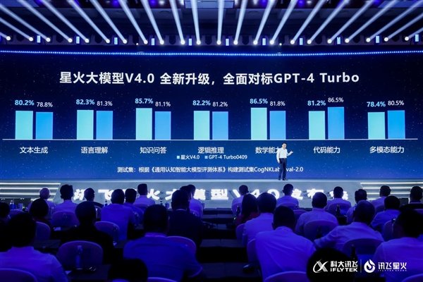 核心提示:快科技6月30日消息,科大讯飞最新发布的讯飞星火大模型V4.0,在多个关键能力上实现了对GPT-4Turbo的超越。在近日的发布会上,科大讯飞董事长刘庆峰宣布,星火V4.0在文本生成、语言理...