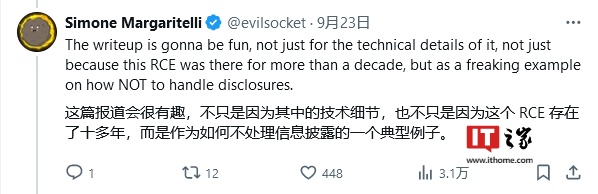 软件开发人员 Simone Margaritelli 于 9 月 23 日在 X 平台发布推文,率先曝料了这些 RCE 漏洞,目前已经通知相关开发团队,并会在未来两周内完全披露。
