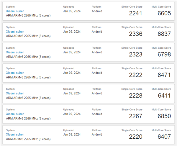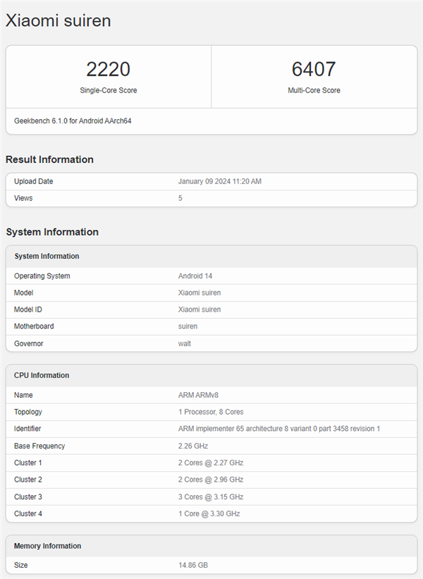 日前,小米一款代号为“Xiaomi suiren”的新机在跑分平台Geekbench上现身,预计将是小米14 Ultra。