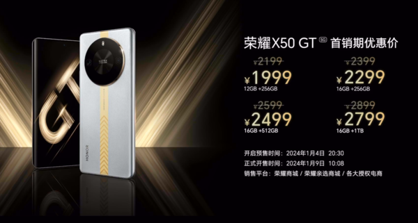 1月4日晚19:30,荣耀召开了新品发布会,在此次发布会上,荣耀正式推出了荣耀X50 GT。新机共提供12GB+256GB、16GB+256GB、16GB+512GB和16GB+1TB四个版本,首销价分别为1999、2299、2499和2799元。新机将于1月9日10点08分正式开售。