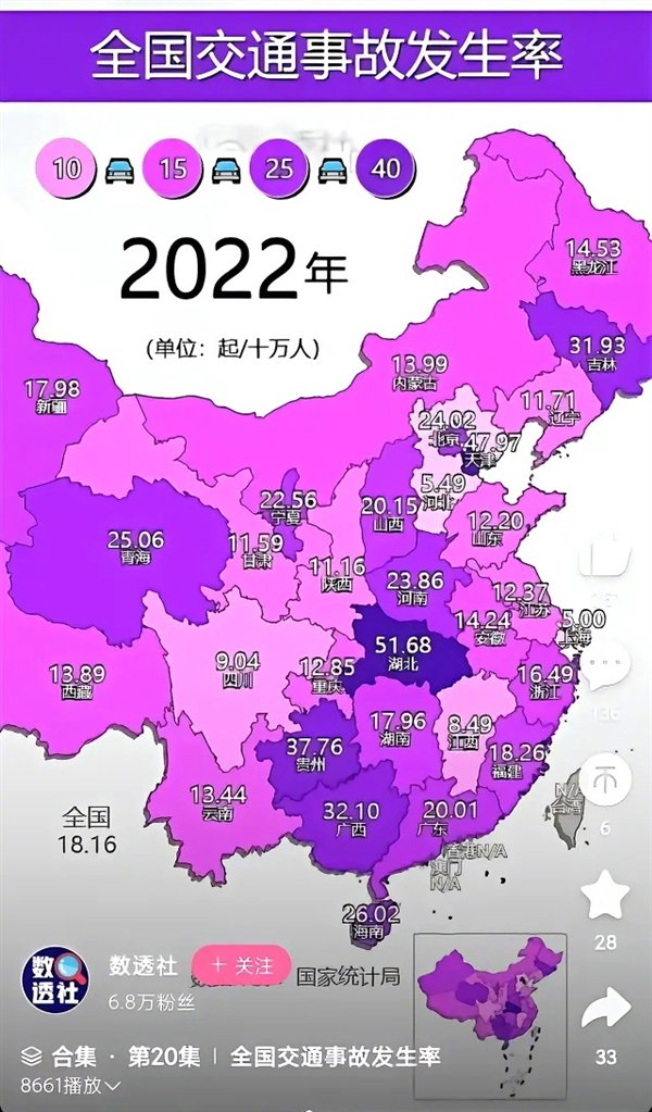 从相关博主晒出的图片统计来看,全国交通事故发生率上,湖北、天津和贵州排在前三名,而广西、吉林、河南、宁夏等紧随其后。