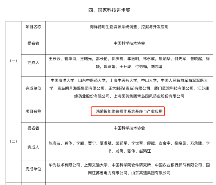 细节方面,中国科学技术协会提名“鸿蒙智能终端操作系统基座与产业应用”为2023年度国家科技进步奖,该技术的完成单位包括华为技术有限公司、上海交通大学、中国科学院软件研究所等。与“鸿蒙智能终端操作系统基座与产业应用”一同被提名的,还包括“海洋药用生物资源系统调查、挖掘与开发应用”“非粮型饲料资源挖掘与安全利用关键技术创新及应用”等技术。