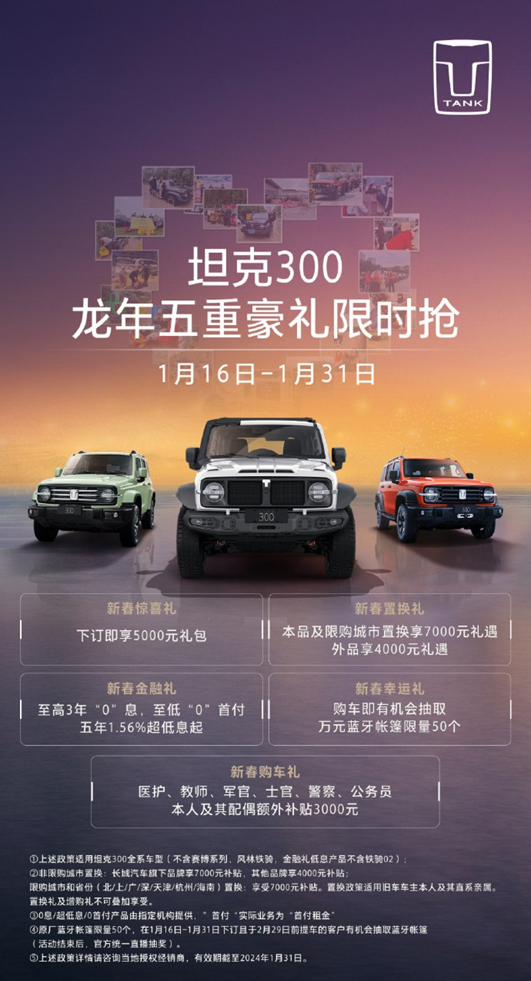 IT之家 1 月 18 日消息,近日,坦克 300 推出限时购车政策,用户在 2024 年 1 月 16 日-1 月 31 日下订坦克 300 全系车型(不含赛博系列、风林铁骑)可享 5000 元礼包,同时还提供置换礼、金融礼、幸运礼、购车礼等。