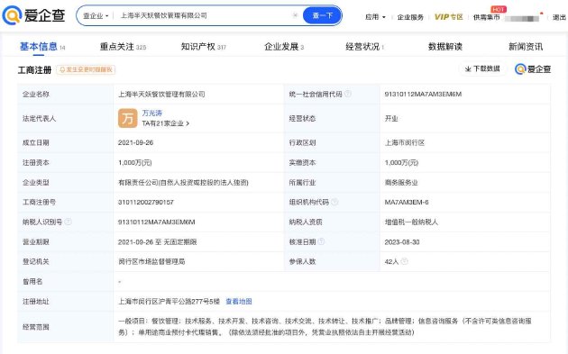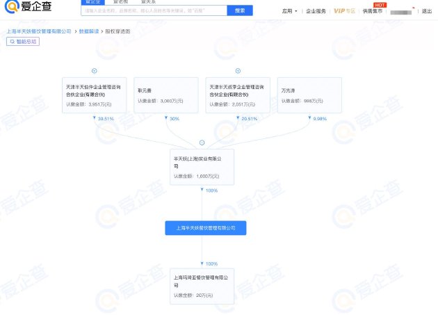 爱企查App显示,半天妖关联公司上海半天妖餐饮管理有限公司成立于2021年9月,法定代表人为万光涛,经营范围包括餐饮管理、技术服务、品牌管理、信息咨询服务、单用途商业预付卡代理销售等。股权穿透图显示,该公司由天津半天伯仲企业管理咨询合伙企业(有限合伙)、天津半天叔季企业管理咨询合伙企业(有限合伙)、耿元善等间接持股。2022年报信息显示,该公司参保人数为42人。