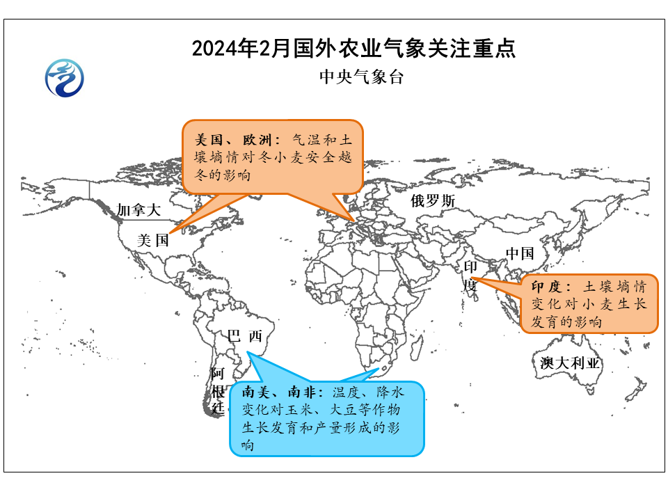 2024年2月,欧洲和北美地区需关注气温和土壤墒情对冬小麦安全越冬的影响,南美地区、南非、印度需关注温度、降水和土壤墒情变化对小麦、玉米、大豆等作物生长发育和产量形成的影响。